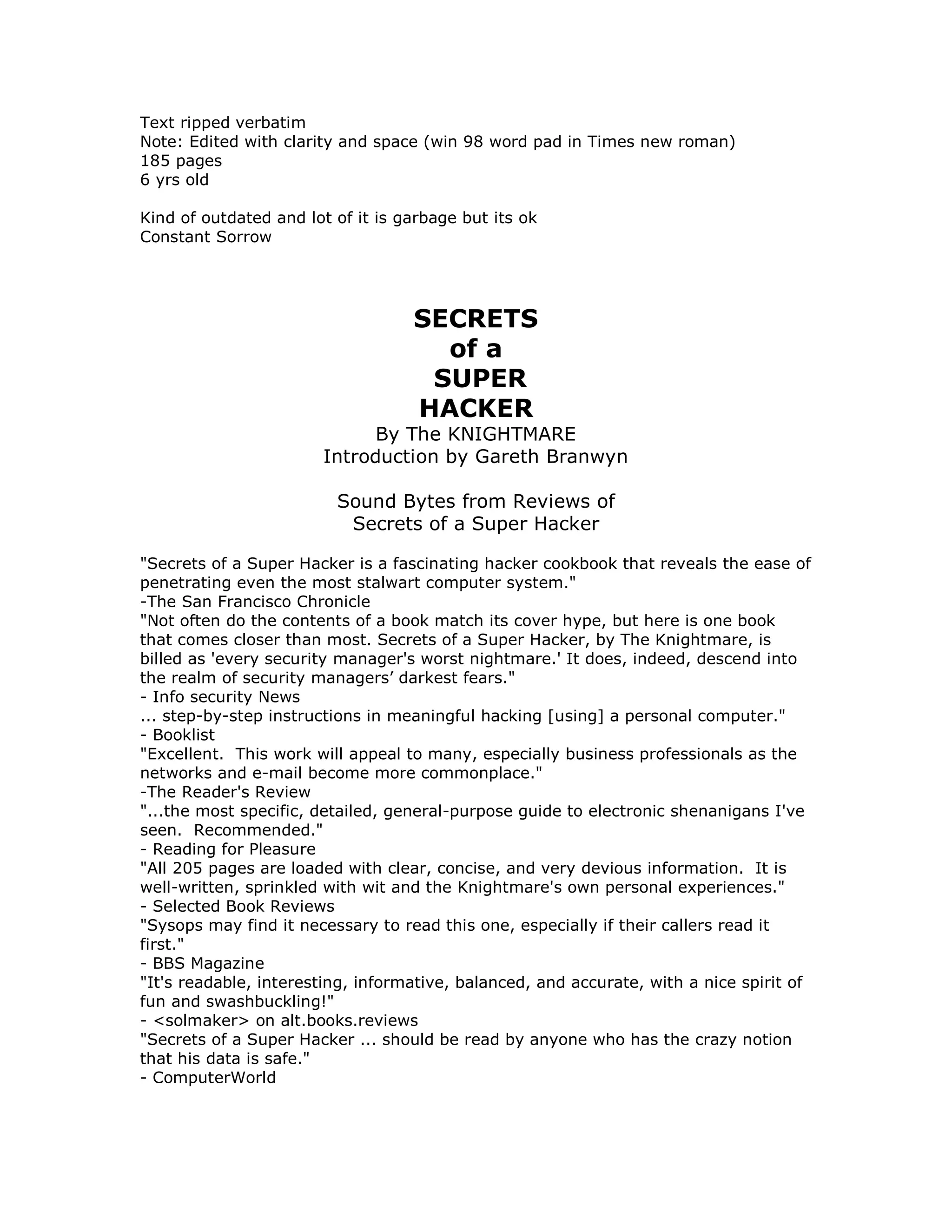 This document summarizes a book titled "Secrets of a Super Hacker" by The Knightmare. It provides an introduction by Gareth Branwyn discussing different myths around hackers as independent scientists, cowboys, and techno-terrorists. The book itself contains 15 chapters that provide step-by-step instructions for hacking techniques and how to avoid getting caught, addressing topics like researching targets, passwords, social engineering, hacking from public computers and dial-up, and applicable computer crime laws.