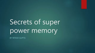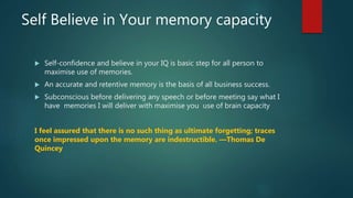 This document provides techniques for improving memory and maximizing one's IQ. It recommends having self-confidence in one's memory capacity and viewing an accurate memory as important for business success. It suggests picturing words in sequences of related images using exaggeration and substitution to form memorable associations. Close observation of details is also advised as a method to increase concentration through meditation. These memory techniques are proposed as useful for business management, public speaking, presentations, and student learning.