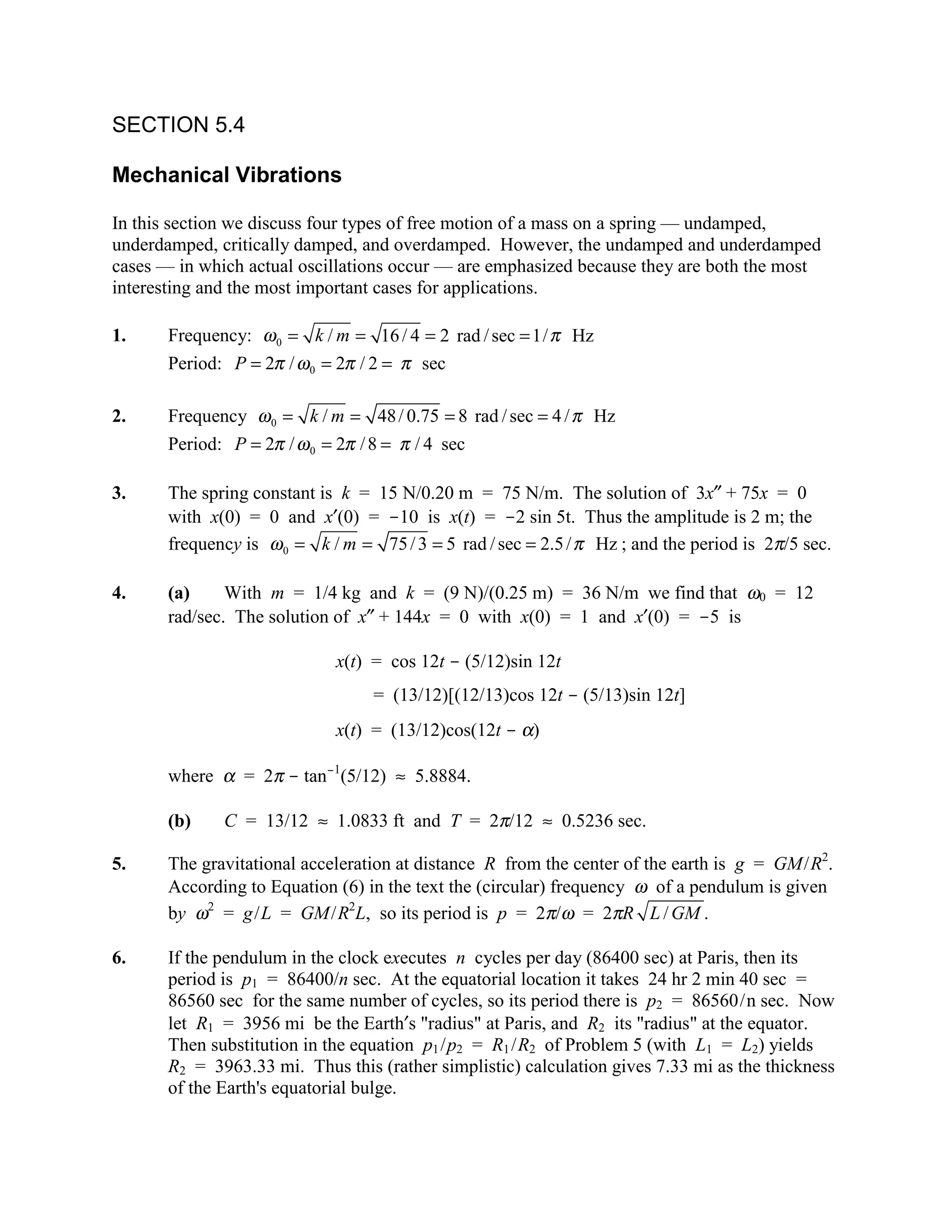 This document discusses various types of mechanical vibrations including undamped, underdamped, critically damped, and overdamped motion. It provides examples of solving differential equations describing simple harmonic motion under different damping conditions and applying the solutions to problems involving springs, pendulums, and other oscillating systems. Specific cases are worked through to determine characteristics like frequency, period, and damping behavior.