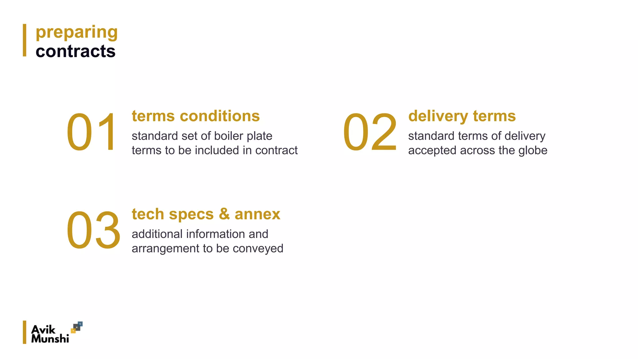 The document outlines key components for preparing contracts, including terms and conditions, delivery terms, and price/payment structures. It details the obligations surrounding delivery timelines, liability transfer, warranty provisions, and dispute resolution procedures. Additionally, it addresses technical specifications, performance reporting, and the roles of stakeholders in procurement management.