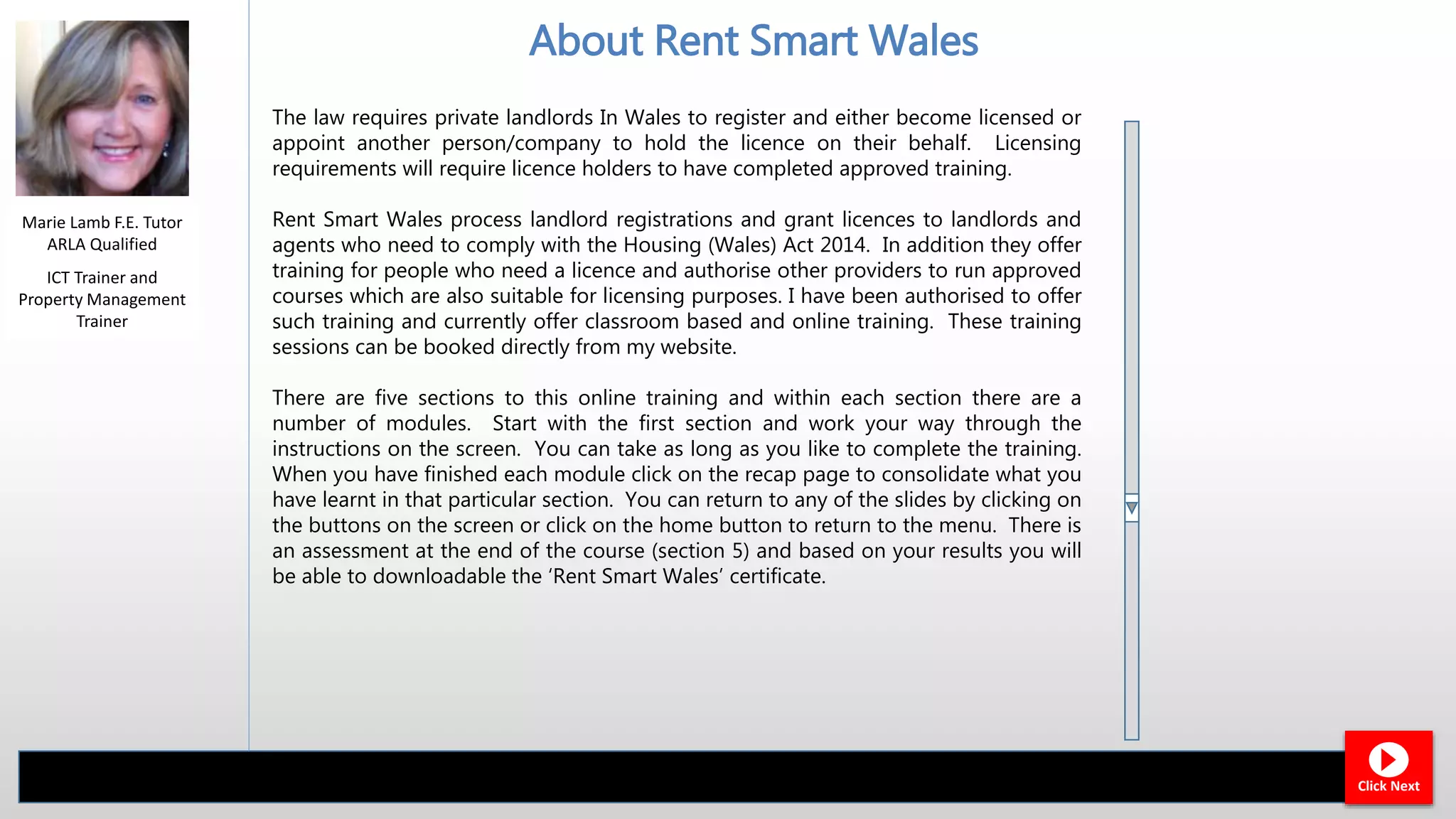 The document provides information about online training for landlords in Wales to become licensed under the Rent Smart Wales scheme. It outlines that the training is divided into 5 sections that cover topics relevant to managing rental properties legally. Learners can progress through modules at their own pace and there is a certificate awarded upon passing an assessment at the end of the course.