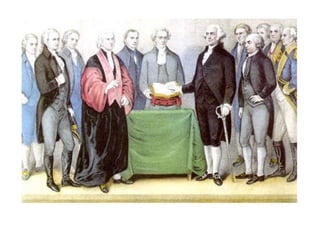 George Washington was elected the first President of the United States in 1789. He faced many challenges in establishing the new government, including a small army, threats from Native Americans and pirates, and no precedent for the presidency. Washington proved to be a capable leader. Alexander Hamilton proposed establishing a national bank and taking on the states' war debts to strengthen the new federal government, which was controversial but approved. The capital was located on the Potomac River in a compromise to gain Southern support.