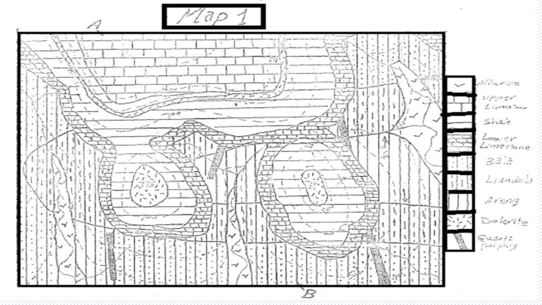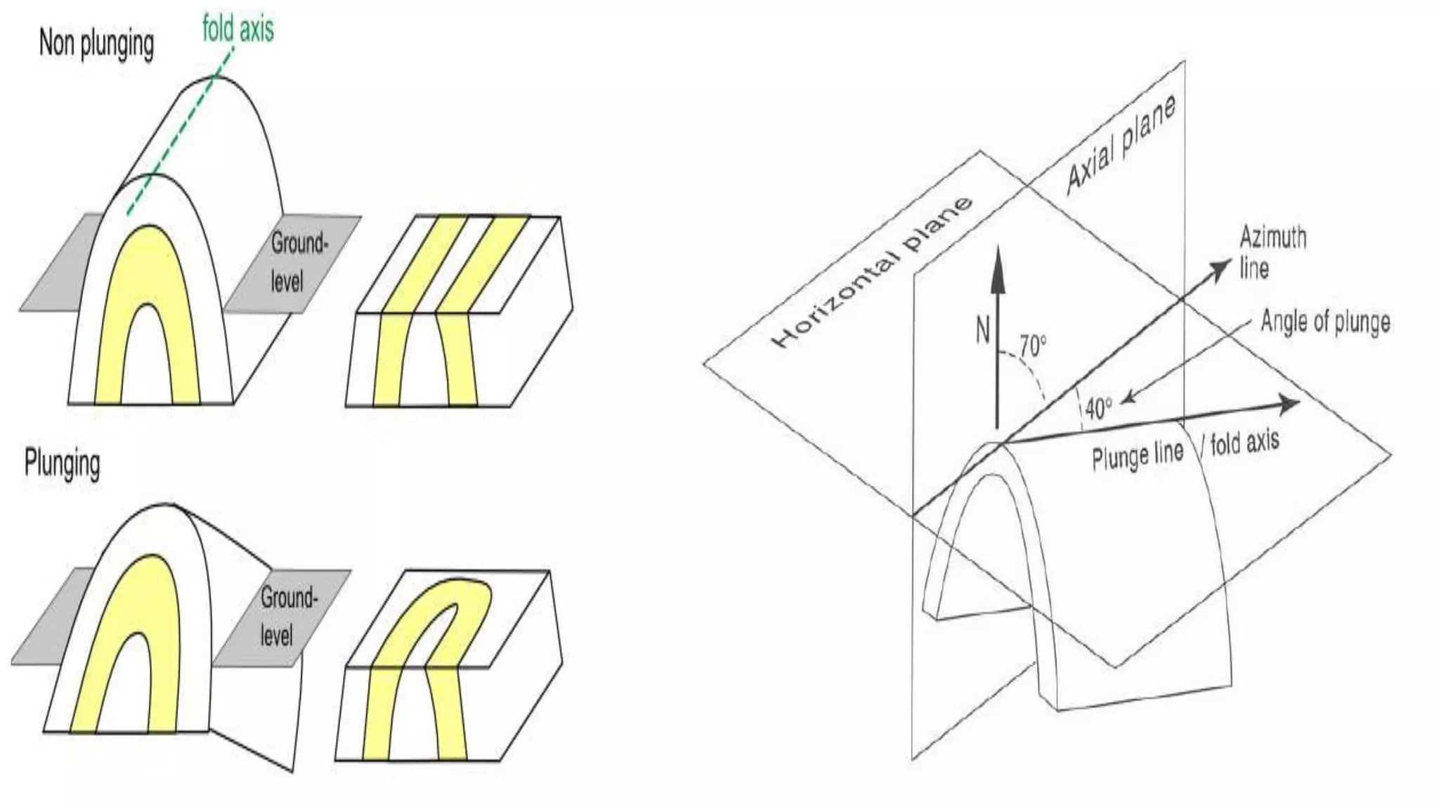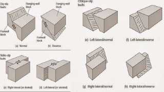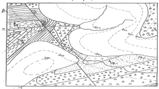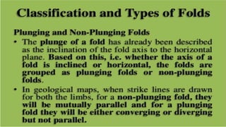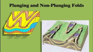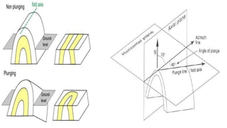 1) There are different types of folds that can be identified on a geologic map based on the attitude of their axial planes and the direction of dip of the strata. Synclines and anticlines can be distinguished by the direction strata dip and the age of the strata. 2) Folds should be described on a map by specifying the type of strata, the direction of the fold axis, any plunge direction, and whether it is symmetrical or not, plunging or not, and if it is a syncline, anticline, or monocline. 3) When writing a report for a geologic map, it is important to discuss the geomorphology, structure geology, topography