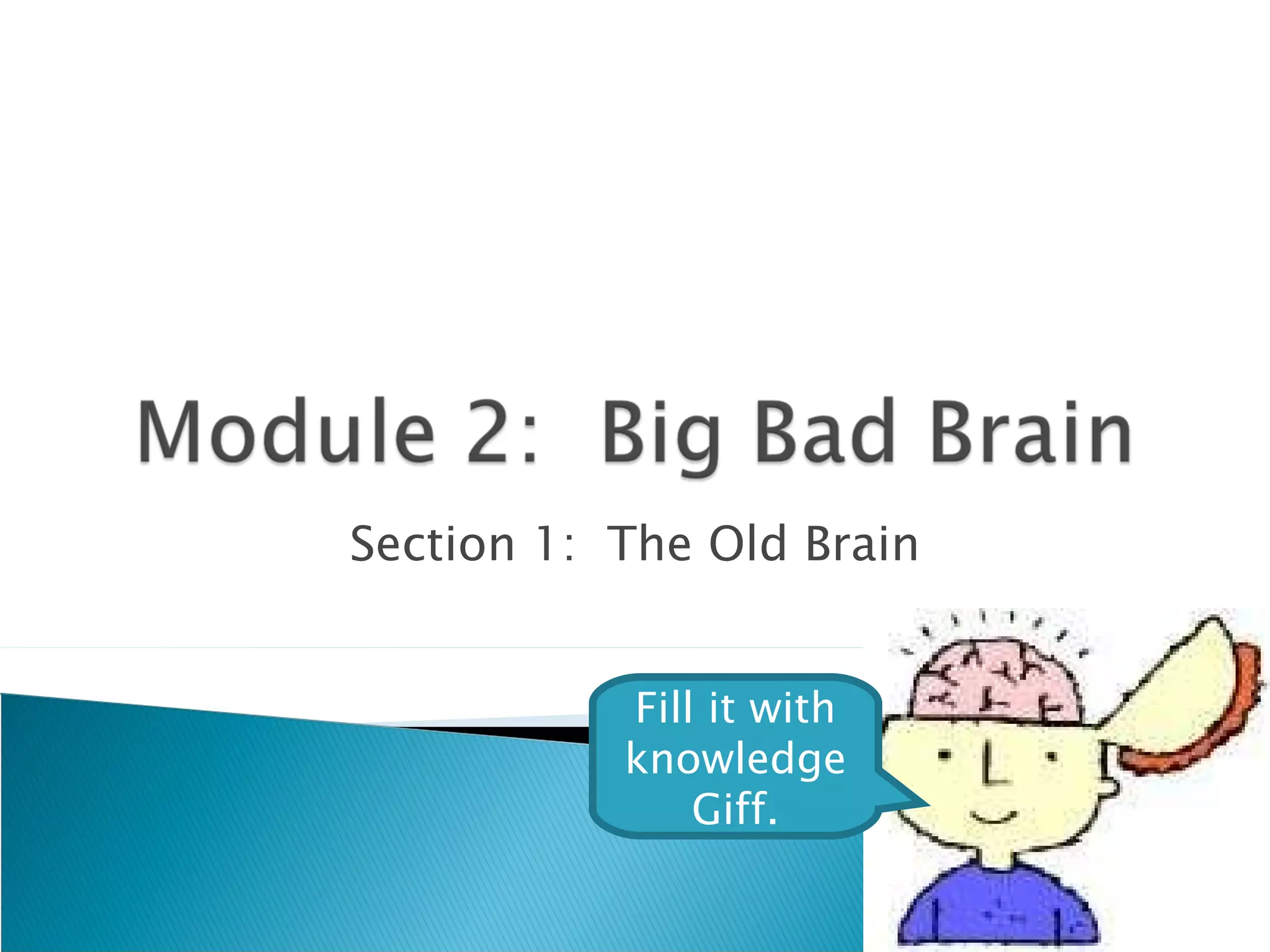 The document discusses different regions of the human brain. It states that the left hemisphere controls the right side of the body and vice versa. It discusses the brainstem, medulla, thalamus and cerebellum as the oldest regions of the brain which control basic functions like breathing, heartbeat, balance and movement. The frontal, temporal, parietal and occipital lobes make up the newer regions of the brain.