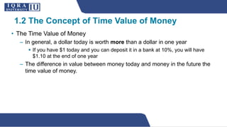 The document discusses the concept of time value of money, which is the principle that money available at the present time is worth more than the same amount in the future due to its potential earning capacity. It defines key terms like interest rate and interest rate factor used to convert cash values over time when money is deposited, borrowed, or invested. Examples are given to illustrate how to calculate the future value of an investment over one year using an interest rate. Timelines are introduced as a way to visualize dates for financial calculations.