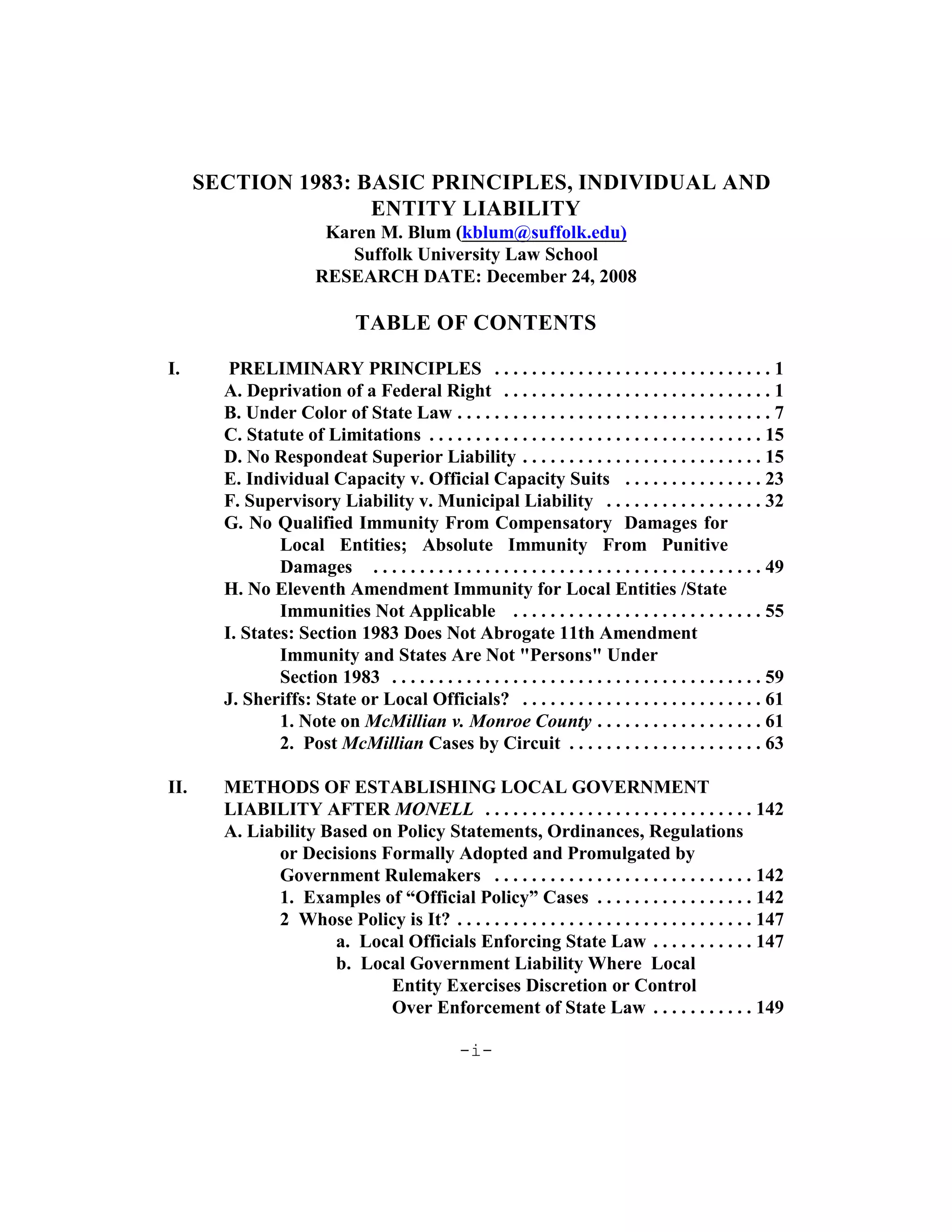This document provides an overview of the basic principles of establishing liability under 42 U.S.C. § 1983. It notes that to establish a § 1983 claim, a plaintiff must assert the deprivation of a federal right. A violation of state law alone is not sufficient. It also discusses that § 1983 does not provide a basis for redressing violations of state law, but rather violations of federal law committed under color of state law. The document provides preliminary background on key § 1983 concepts such as the requirement that the deprivation be under color of state law, statute of limitations issues, the distinction between individual and official capacity suits, and limitations on various types of liability.