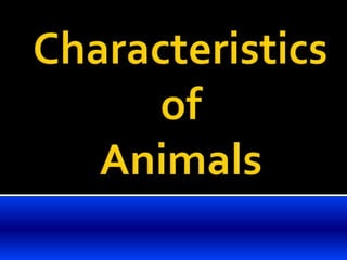 This document summarizes key characteristics of animals. It discusses that animals are heterotrophs that move to find food which is digested inside the body. Animals are also multicellular and diploid, and almost all reproduce sexually. During embryonic development, the zygote forms a blastula and then three germ layers that give rise to tissues and organ systems. Animals display a variety of body plans ranging from radial to bilateral symmetry.