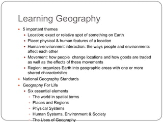 The document outlines 5 themes and 6 essential elements of geography. The 5 themes are location, place, human-environment interaction, movement, and region. The 6 essential elements are: 1) The world in spatial terms, which focuses on location and maps; 2) Places and regions, which describes how Earth is divided; 3) Physical systems, which shape Earth's features; 4) Human systems, which study how humans affect Earth; 5) Environment and society, which examines how humans and environments affect each other; and 6) The uses of geography, which helps understand relationships between people, places and environments over time.