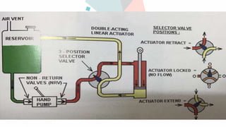 This document provides an overview of the basic components of a hydraulic system. It discusses the minimum components needed for any hydraulic system, including a pump to generate hydraulic pressure, a reservoir to hold the fluid, selector valves to control fluid direction, non-return valves, pressure relief valves, and actuators to convert hydraulic energy into mechanical motion. It also distinguishes between hand pumps, which are manually operated backup pumps, and driven pumps, which are more powerful pumps driven by electric motors or engine gearboxes.