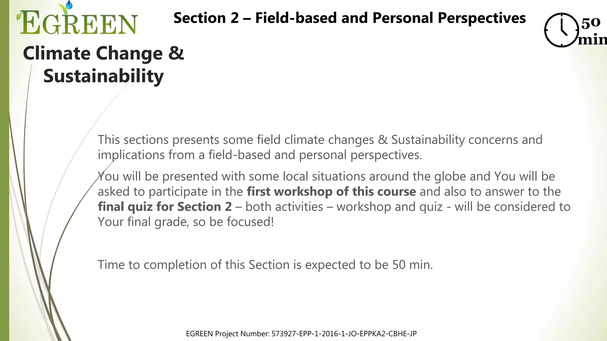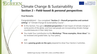 This document outlines the content and activities for Section 2 of a course on Climate Change & Sustainability. Students will watch videos providing field-based perspectives on climate change impacts in Mozambique, Pakistan, Kiribati, and other locations. They will then participate in a workshop by providing examples of actions people are taking to address climate change and actions they could promote personally. Students will also complete a 20 question, 10 minute quiz to assess their understanding of the section's material. Upon completion, they will have gained perspectives on real-world climate impacts and ways individuals are responding.