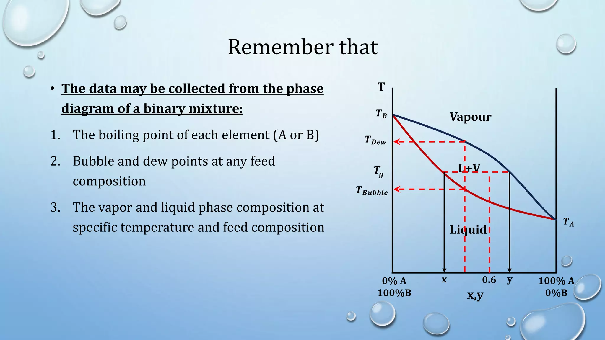 3. Flash distillation separates a feed stream into a vapor and liquid product using equilibrium relationships, and the compositions are solved using operating line equations.