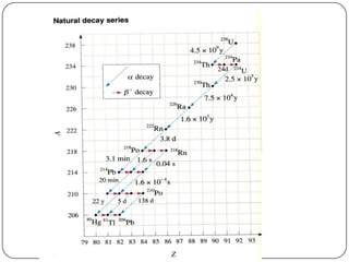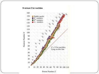 The document discusses the types of radiation emitted during radioactive decay. It describes alpha, beta, and neutron radiation as particulate radiation emitted from atomic nuclei. Alpha radiation consists of helium nuclei, beta radiation can be electrons or positrons, and neutron radiation emits neutrons. Electron capture and internal conversion are also discussed as alternative decay processes.