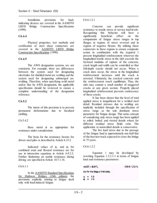 This document summarizes key provisions related to steel structures in Section 6 of the specifications. It discusses how elements are proportioned based on their structural action like tension, compression, flexure, etc. It also discusses requirements for connections, splices, and specific structural types. Key points covered include material properties of steels, fatigue design considerations grouping details into categories, and commentary on orthotropic deck details.
