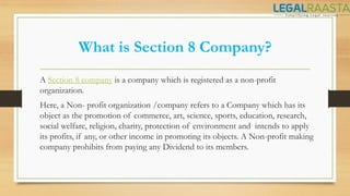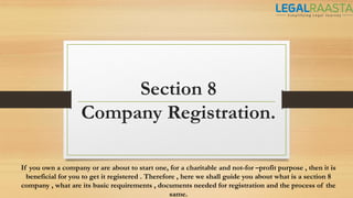 A Section 8 company is a non-profit organization focused on promoting various social causes without distributing profits to its members. To register, essential documents include identification, proof of address, and consent forms, followed by steps such as applying for digital signatures and unique company names. The registration process typically takes about 20 days, and LegalRaasta offers services to assist with the process.
