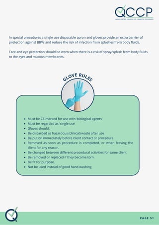 Individuals working in special procedures may be exposed to occupational hazards like blood and body fluids, physical injuries from needles, and chemicals. Personal protective equipment like disposable aprons, gloves, and eye protection can provide a barrier against hazards and reduce infection risks. Gloves must be single-use, properly disposed of, and changed between different tasks or if torn. Needlestick or sharps injuries require first aid like encouraging bleeding and seeking prompt medical attention to reduce infection risks. Management policies address preventing and controlling exposures, safe sharps use and disposal, cleaning, and first aid responses.