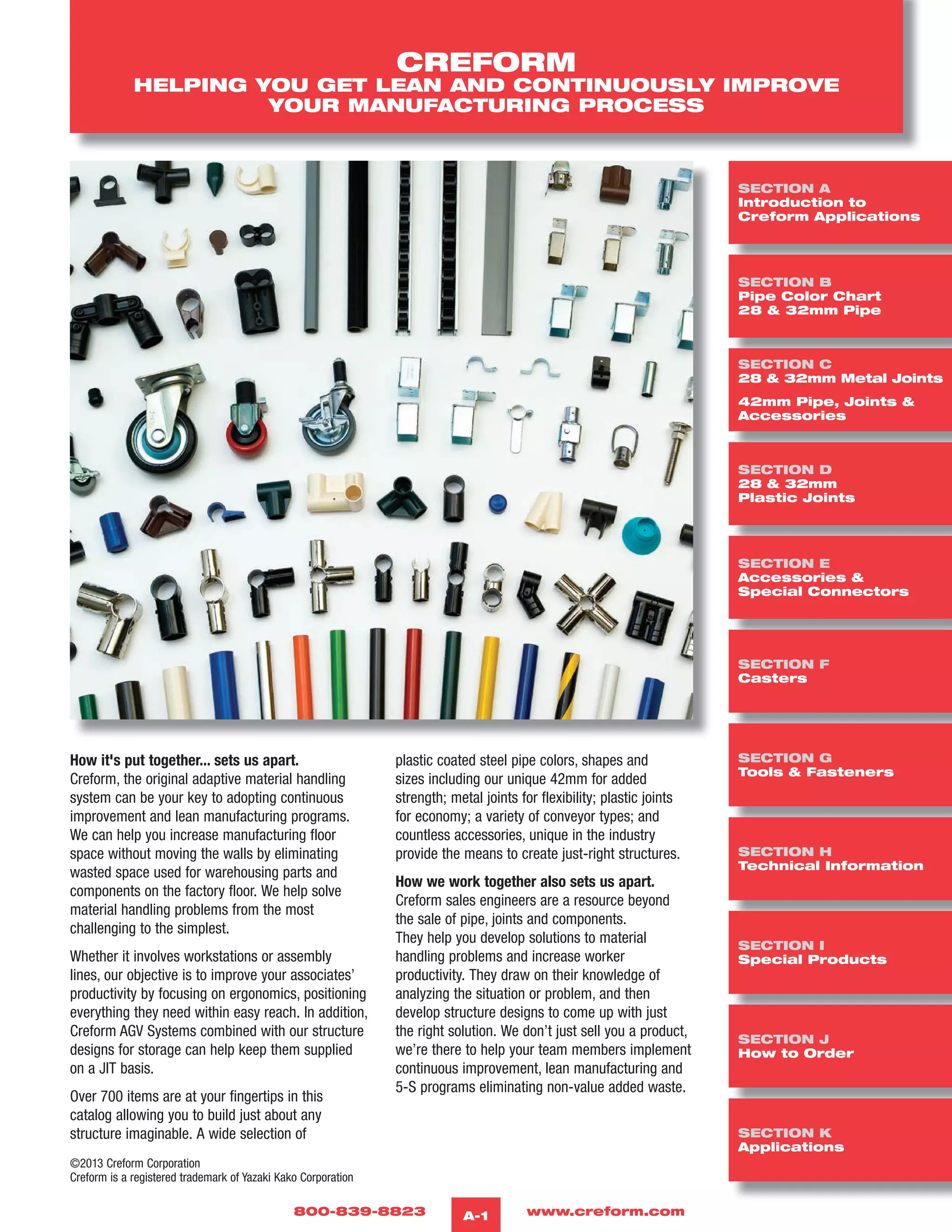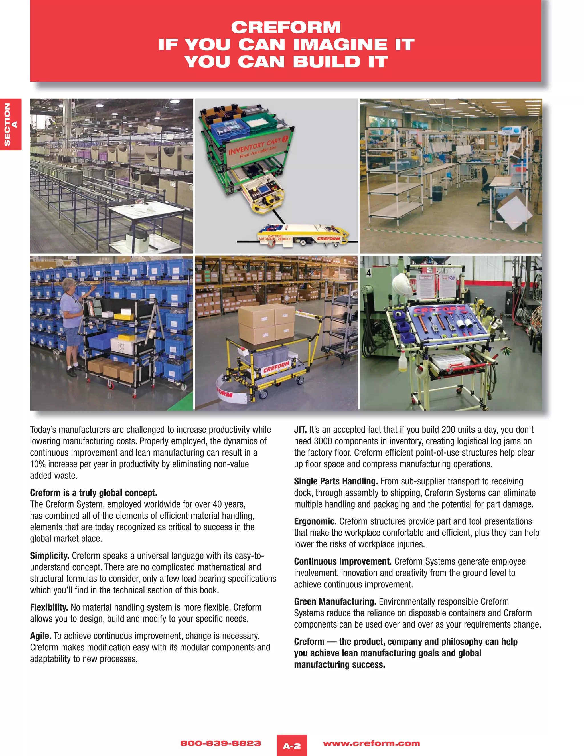 Creform provides material handling systems to help manufacturers implement lean practices and continuous improvement. Their modular pipe and connector system allows for flexible construction of storage racks, workstations, and carts. Creform sales engineers assist customers in analyzing their needs and developing customized solutions to improve productivity, inventory management, and ergonomics on the manufacturing floor.
