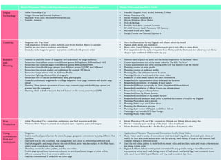 This document outlines the tasks for a college music magazine project and accompanying music video. For the magazine, the student researched conventions of real magazines and created a preliminary mock-up including a cover, contents page, and double page spread using Adobe Photoshop. For the music video, the student planned concepts, researched conventions, created a storyboard in iMovie, and produced the final video using Adobe Premiere Elements. Across both projects, the student applied researched conventions while adding their own creative elements.