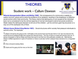 Social disorganization theory claims that delinquency results from the inability of a community to realize shared values and solve resident problems, leading to a breakdown in social control. Strain theory suggests that social structures can pressure individuals into crime by creating goals they cannot legally achieve. For example, the gang in City of God forces Steak to kill a child through threats of violence, and the poverty and instability of the city provide an environment of frustration that strains residents and may lead them to criminal decisions in hopes of escaping their situation.