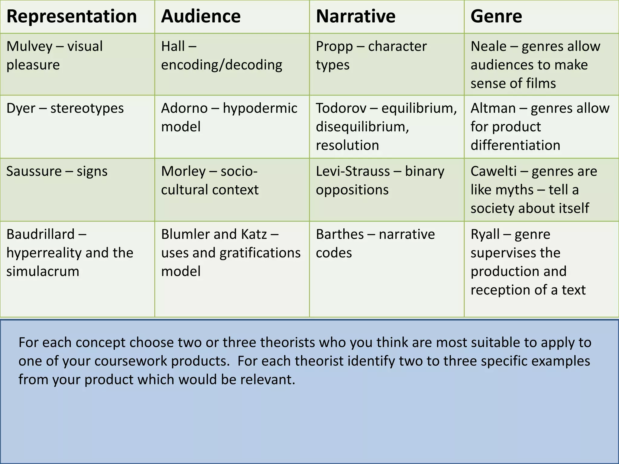 For each conceptchoose two or three theorists who you think are most suitable to apply to one of your coursework products. For each theorist identify two to three specific examples from your product which would be relevant.