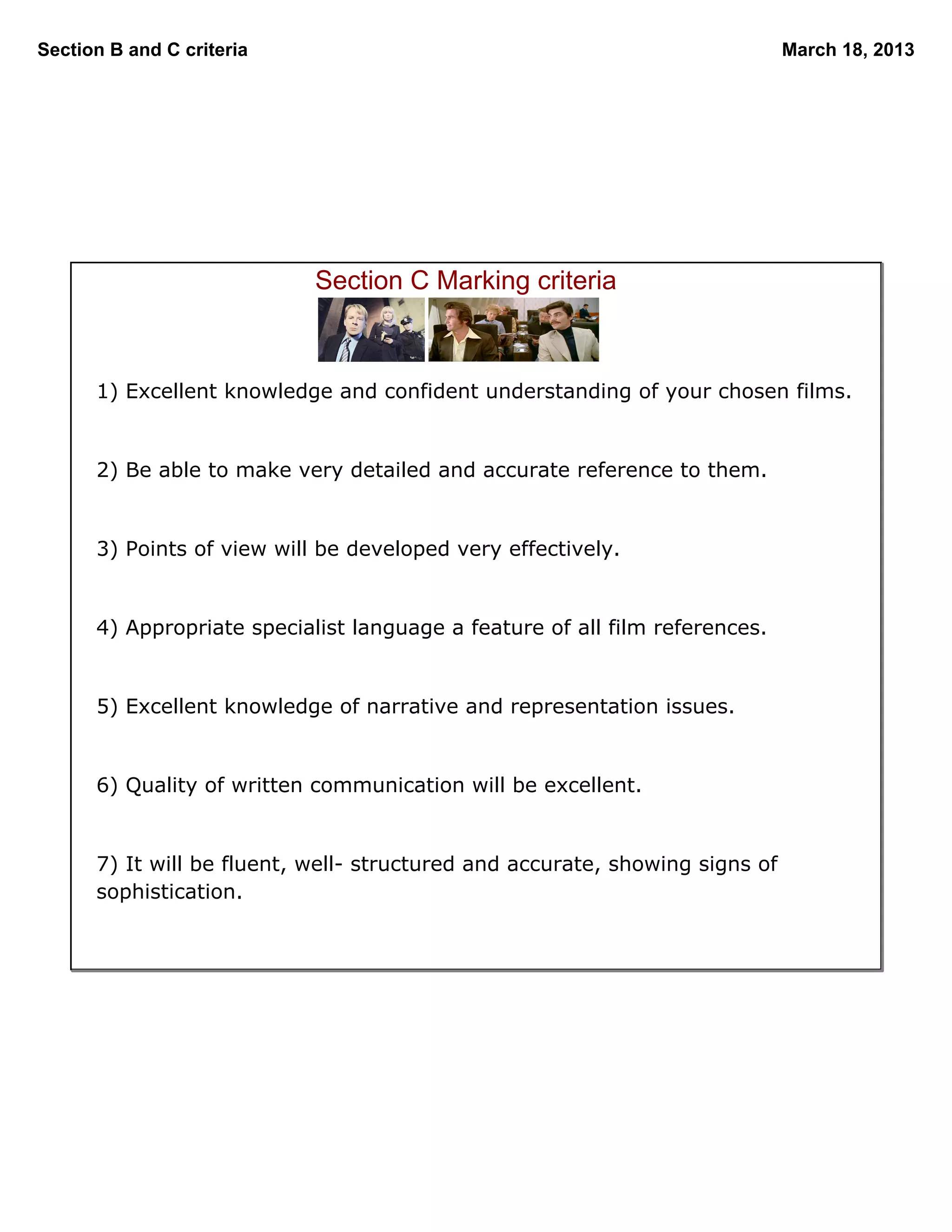 This document outlines the marking criteria for Section C of an exam. It lists 7 criteria for an excellent answer, including demonstrating excellent knowledge of chosen films through detailed references, developing points of view effectively, using appropriate specialist language, showing excellent knowledge of narrative and representation issues, and writing in a fluent, well-structured, sophisticated and accurate manner.
