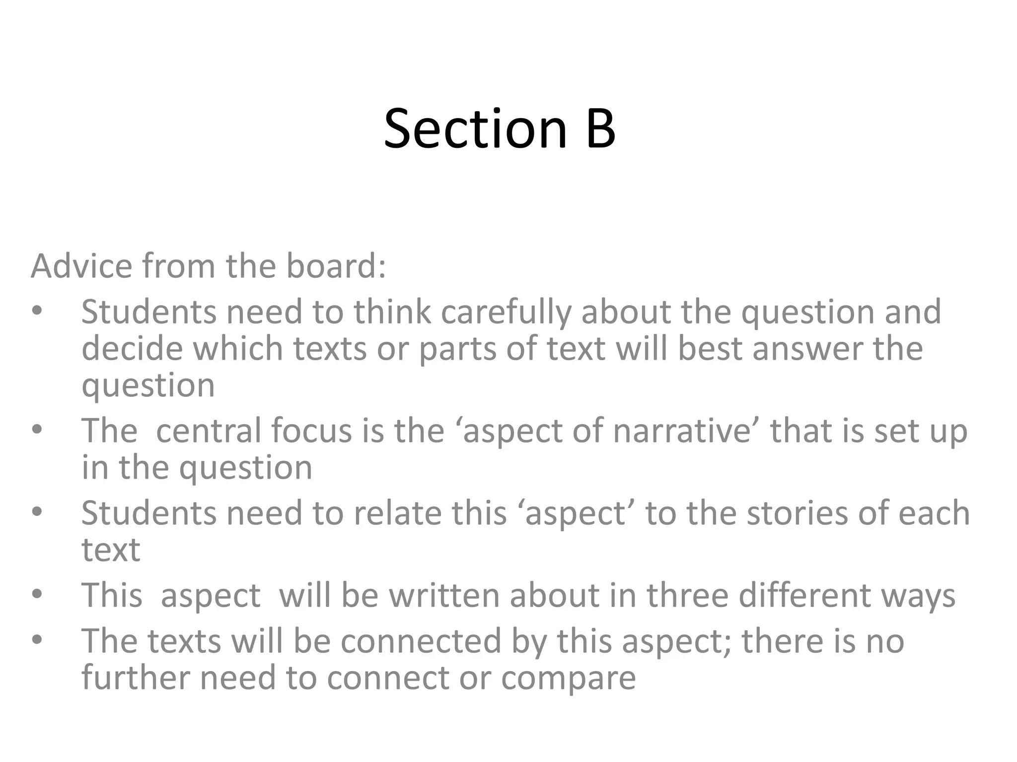 The document provides advice for students on how to answer a Section B question for an exam. It advises students to carefully consider the question and decide which texts and parts of texts will best answer the aspect of narrative focused on in the question. Students should relate this aspect to the stories in each text and discuss it in three different ways as it relates to the texts. The texts should be connected by this common narrative aspect.
