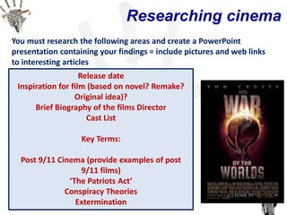 The document provides instructions to research various aspects of cinema such as the release date, inspiration, director biography, and cast list of a film and create a PowerPoint presentation with findings and include pictures and links. It also lists key terms to research related to post-9/11 cinema, conspiracy theories, extermination, Joseph McCarthy, the Red Scare, assimilation, and McCarthy witch hunts.