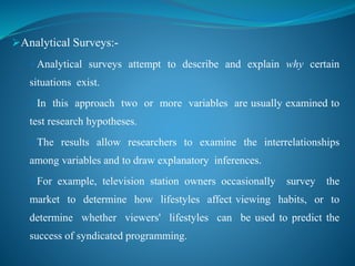 The document discusses various types of surveys including descriptive and analytical surveys, outlining the methods used to gather and interpret data. It emphasizes the importance of sampling methods, detailing the differences between probability and non-probability samples, and several sampling techniques such as simple random sampling, systematic sampling, stratified sampling, and cluster sampling. The document also highlights the significance of representative samples for valid research findings while noting the challenges and errors associated with different sampling approaches.