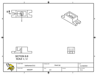 The document contains engineering drawings with section views of a part labeled A-A, B-B, and E-E at a scale of 1/2. The drawings include information about the student, drawing name, date, teacher, scale, material, and class for an engineering class assignment.