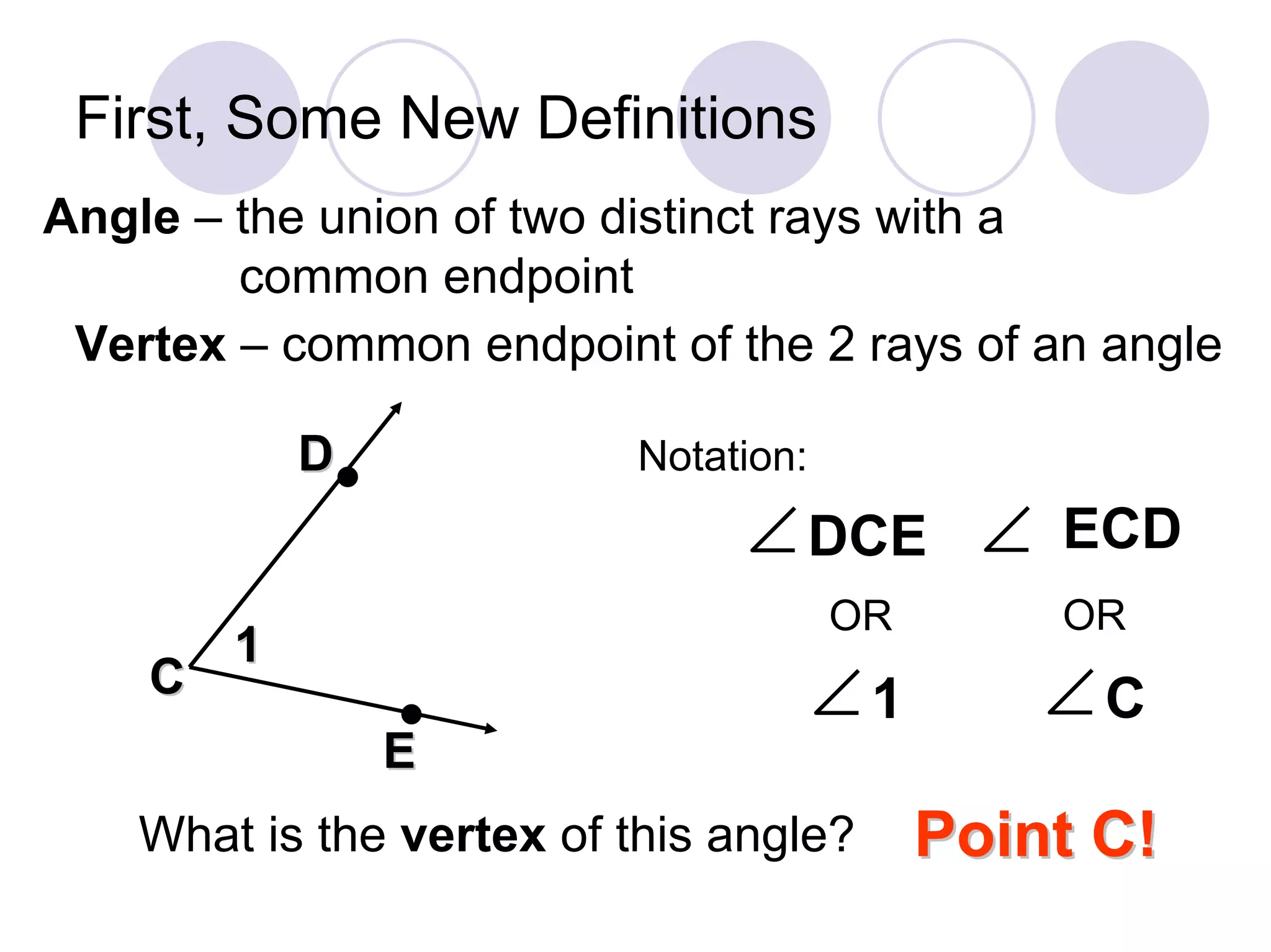 1) It defines an angle as the union of two rays with a common endpoint called the vertex.