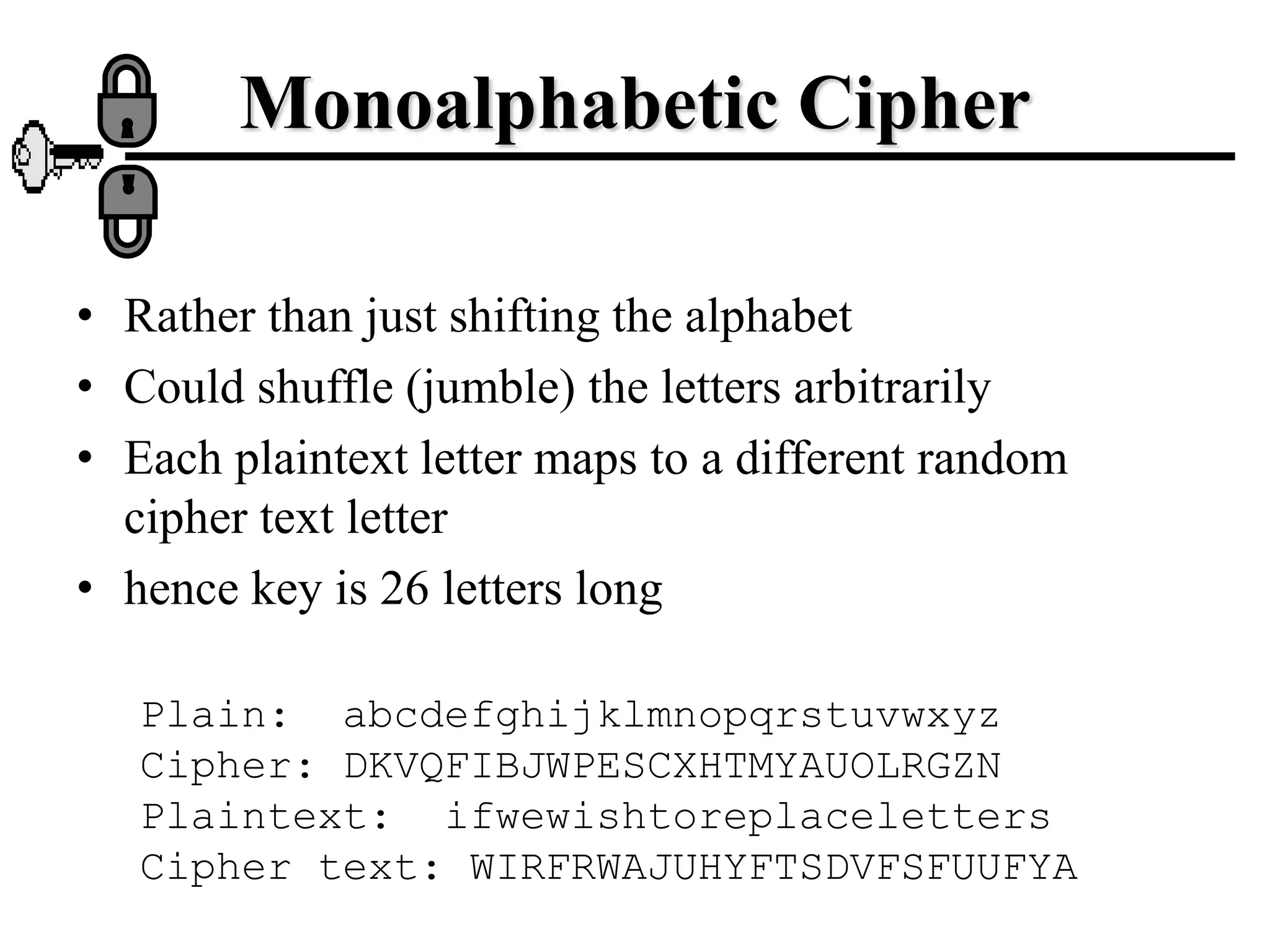 The document discusses various ciphers and their security, including monoalphabetic substitution ciphers, the Playfair cipher, and the Hill cipher. It explains that while monoalphabetic ciphers have many possible keys, the regularities of language allow them to be broken through frequency analysis of letters in the ciphertext. The Playfair cipher improves security by encrypting digrams rather than single letters, but plaintext patterns remain. The Hill cipher encrypts multiple letters together using matrix multiplication, further obscuring the original message.