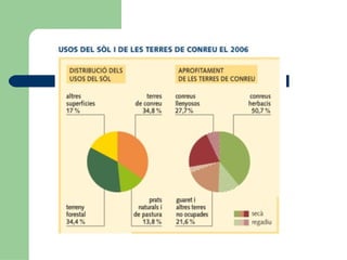 Canvis en elsusos en els darrers anys: Disminueixen les terres de conreu un 12 %. Augmenta el terreny forestal 9%. Causes: Abandonament de les terres menys productives Augment de la ramaderia Construcció d’àrees residencials o d’infraestructures. Agricultura de secà predomina sobre la de regadiu.