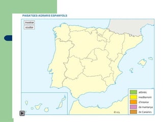 Paisatges agraris espanyolsPaisatge: defineix un marc fíisic, les activitats humanes i l’organització social d’un espai. Factors que el determinen: Naturals: clima i relleu. Socials: hàbitat (dispers o agrupat) i les comunicacions. Culturals. Elements visibles: Cobertura vegetal: arbòria, arbustiva, herbàcia Grandària Tipus d’explotació Ramaderia estabulada o no. Exemple p.119.