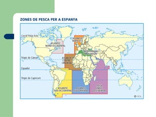 http://fernandojromerob.googlepages.com/lapesca Dieta mediterrània:35 k/habitant i any. (p. 120) Peix blanc (lluç i llucet), peix blau (sardines, anxoves, tonyina, bonítol) Millors caladors: plataformes continentals (corrents marins freds rics en plàncton) la plataforma espanyola pobre (p.115 mapa) recerca de caladors més rics: