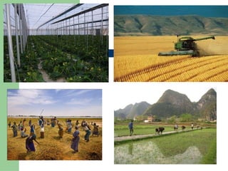 Classificació de l’agricultura:Agricultura de subsistència o tradicional // agricultura de mercat o comercial Segons la varietat de productes: policultiu o monocultiu. Segons l’aprofitament del sòl: intensiva o extensiva. Segons l’ús de l’aigua: de secà o de regadiu. Segons el tipus de parcel·les: camps oberts o openfields // camps tancats o bocage .
