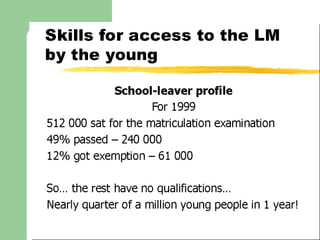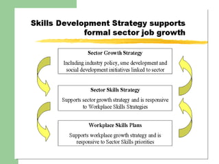 The document outlines South Africa's need for a skills development strategy to address high unemployment and inequality. It proposes using skills training to support growth in the formal sector, SME sector, and development sector to create jobs. The strategy would establish a levy/grant system through SETAs to fund workplace training. It aims to develop learnerships, provide accredited qualifications, and support lifelong learning to improve employment prospects, especially for youth and designated groups.
