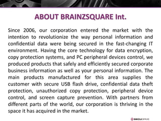 BrainzSquare Int. manufactures secure USB drives that encrypt data to prevent data leakage even if the drive is lost or stolen. Their main product lines include the SECUDRIVE USB Basic, SECUDRIVE USB Office, and SECUDRIVE USB Enterprise, which offer varying levels of encryption, automatic locking, copy protection, and virus protection. These drives are compatible with Windows XP and above and can store files for programs like MS Office and media files.