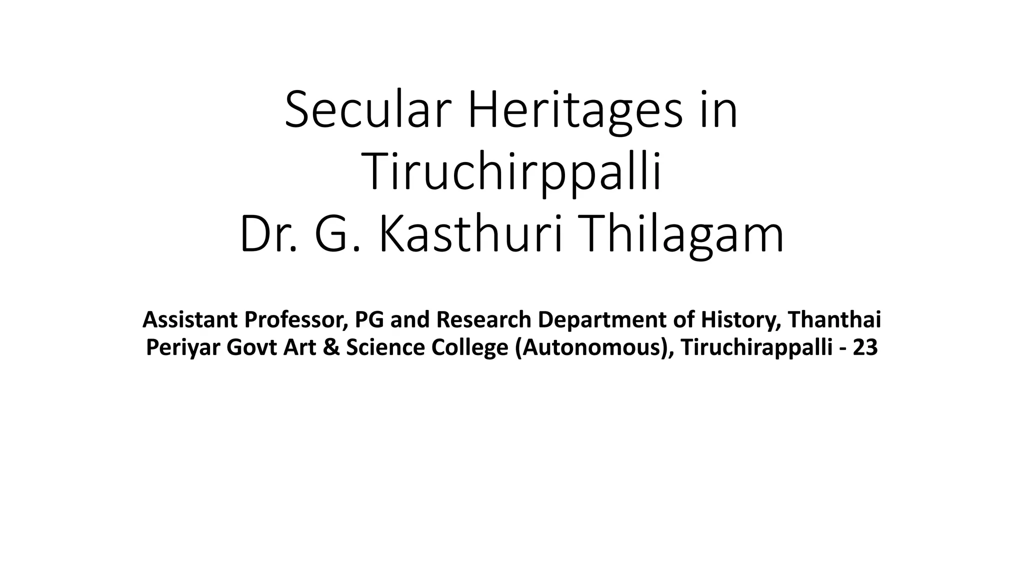 1) The document discusses secular heritages and monuments in Tiruchirappalli, India, including the Fort Gate Way (Main Guard Gate) and the regional museum.