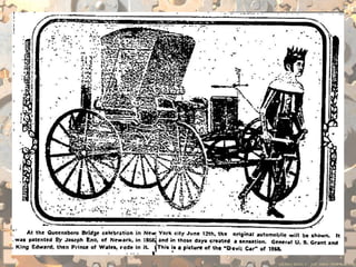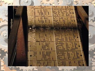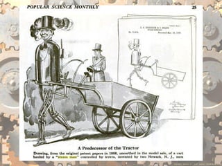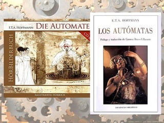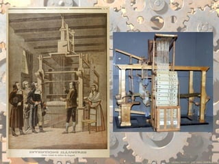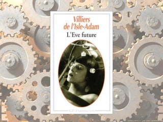 The document discusses various inventions and developments from the 19th century including Joseph Marie Jacquard's improvements to textile manufacturing, E.T.A. Hoffman and Auguste Villiers de l'Isle-Adam's contributions to romanticism, and Mary Shelley's novel Frankenstein. It also mentions several mechanical or electric machines invented between the 18th and 19th centuries like the Steam Man, mechanical horse, electric walking machine, electric man, and Mademoiselle Claire.