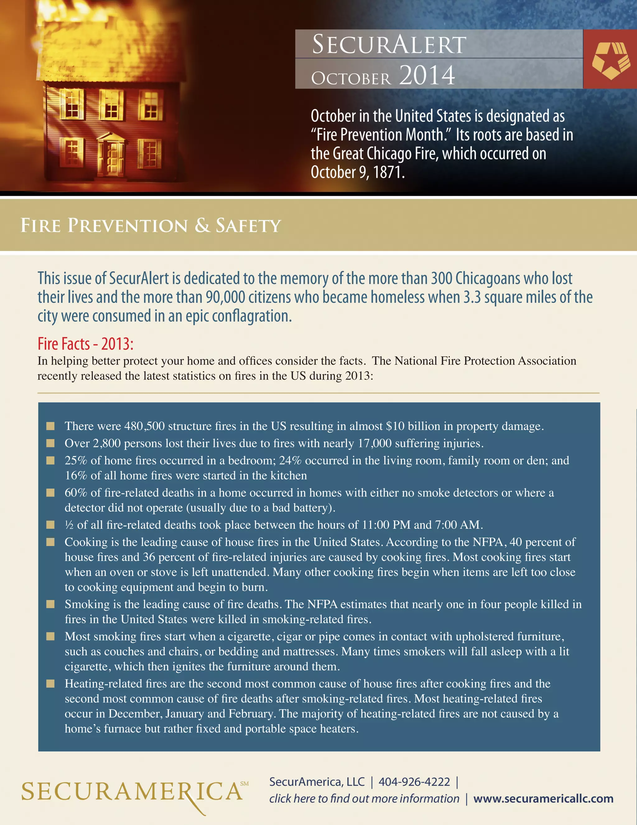 Fires in the US resulted in over $10 billion in property damage in 2013, with over 2,800 deaths and nearly 17,000 injuries. Cooking fires were the leading cause of home fires, while smoking was the leading cause of fire deaths. Proper use of smoke detectors and having an evacuation plan can help reduce fire risks and increase safety.