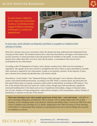 A June 2014 report highlights a significant increase in active shooter incidents in the U.S., with projections indicating 20 events by the end of the year. Active shooters typically target soft locations like workplaces and schools, and they often exhibit signs of distress prior to their attacks. Preparedness measures outlined include recognition of emergency exits, participation in drills, and effective communication with law enforcement during an incident.