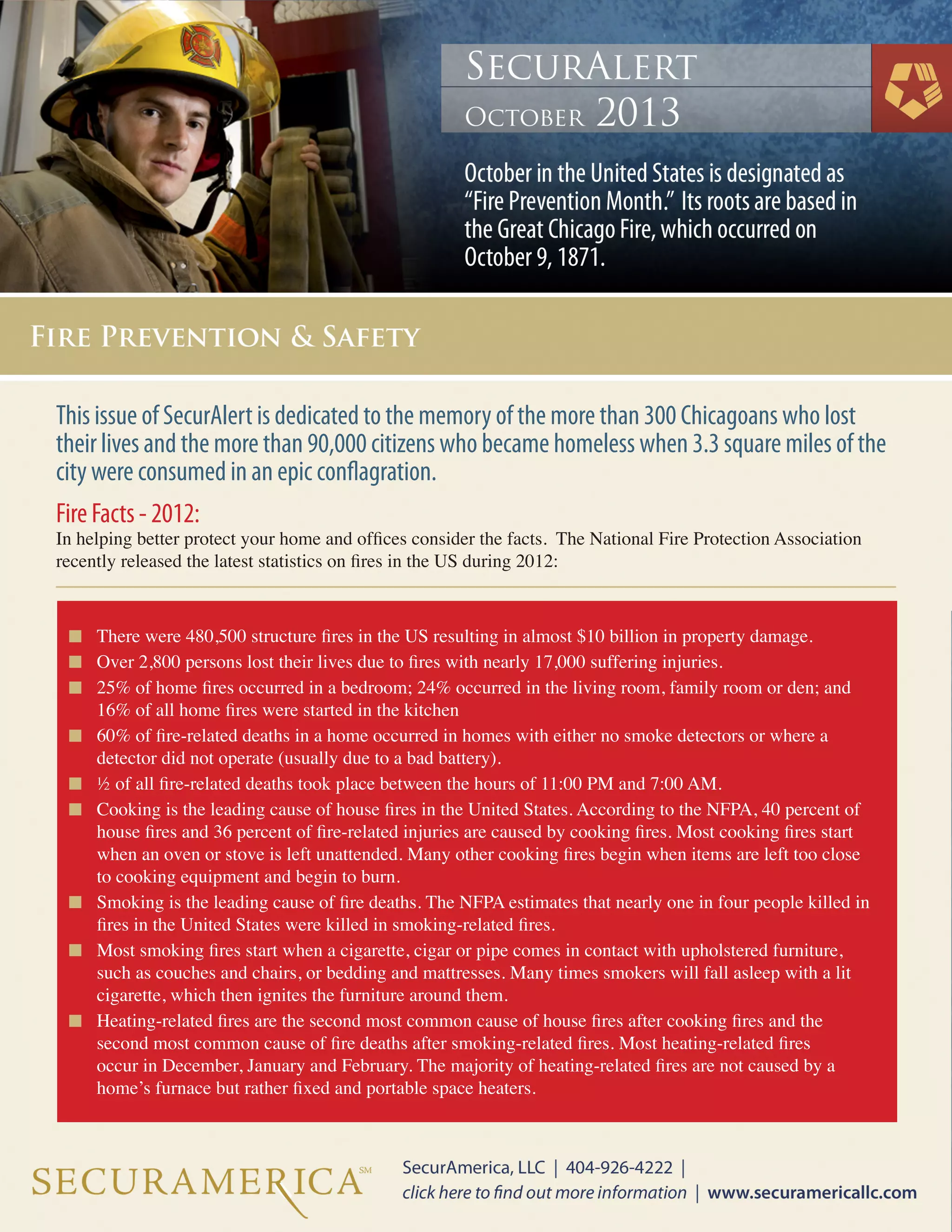 This document discusses fire safety, highlighting the tragic impact of fires in Chicago and providing statistics about fires in the U.S. in 2012. It offers crucial safety tips for preventing and responding to fires in homes and offices, with emphasis on the importance of smoke detectors, cooking safety, and proper evacuation plans. Additionally, it addresses specific safety measures for children and seniors, promoting awareness and preparedness to reduce fire-related injuries and fatalities.