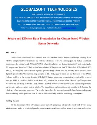 The document describes a proposed system for secure and efficient data transmission in cluster-based wireless sensor networks. It proposes two protocols, SET-IBS and SET-IBOOS, that use identity-based digital signatures for security. SET-IBS relies on the Diffie-Hellman problem while SET-IBOOS relies on the discrete logarithm problem. The proposed protocols aim to reduce computational overhead for security compared to existing approaches. Simulations show the proposed protocols have better performance in terms of security overhead and energy consumption.