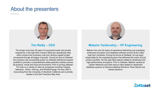 The document discusses secure data sharing in OpenShift environments and emphasizes the importance of encryption to protect sensitive data amid rapid digital transformation. It highlights the role of Zettaset's xCrypt solution in providing transparent, high-performance encryption, ensuring data security across various deployment environments such as on-premises, hybrid, and multi-cloud. Key challenges in data security, including the need for automated key management and the integration of security within development processes, are also addressed.