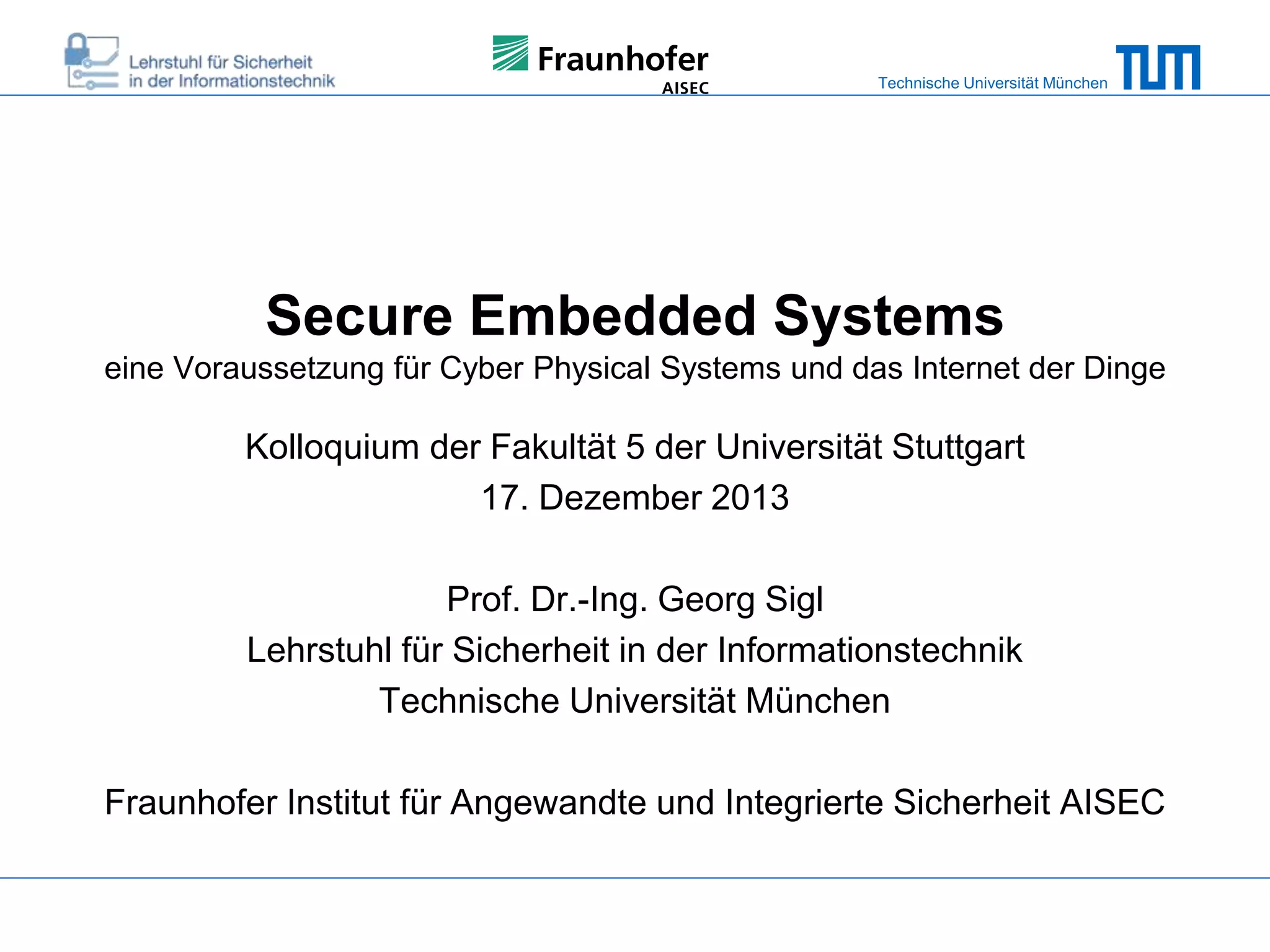 The document discusses secure embedded systems as a requirement for cyber physical systems and the internet of things. It begins by providing examples of attacks on modern embedded systems like cars, industrial control systems, smart grids, and medical devices. It then discusses trends increasing security risks for embedded systems like network connectivity and standardization. Finally, it outlines requirements for future secure embedded systems and describes techniques like hardware security modules, secure elements, physical unclonable functions, and trusted operating systems to provide security in embedded systems going forward.