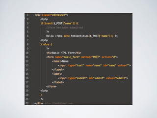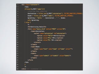 The document discusses secure form processing, highlighting vulnerabilities such as Cross-Site Scripting (XSS) and Cross-Site Request Forgery (CSRF), which can be exploited to attack web applications. It details specific types of XSS attacks and their implications while presenting preventive measures and best practices through various programming frameworks. Additionally, it recommends security testing tools for assessing vulnerabilities in applications.