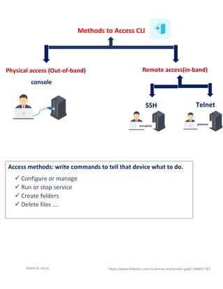 The document discusses secure shell (SSH) and methods for remotely accessing network devices. It explains that SSH uses encryption to securely connect to devices, protecting usernames, passwords, and data from being sent in plaintext like telnet. It provides details on how SSH implements encryption using asymmetric and symmetric encryption algorithms like RSA to encrypt the session key exchange and AES for data transmission. Configuration steps are also provided to set up and enable SSH access on network devices.
