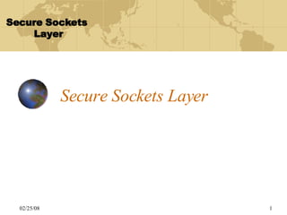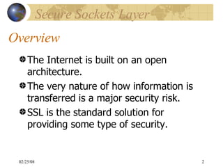 Secure Sockets Layer (SSL) is a standard protocol that provides security features such as encryption, authentication, and integrity to prevent eavesdropping, tampering, impersonation, and spoofing on the internet. It works by encrypting data transmission between a client and server to provide privacy and data security from potential risks on open network architectures. SSL specifications include encryption, authentication, tamper detection, and nonrepudiation to address security risks of eavesdropping, tampering, impersonation and spoofing on the internet.