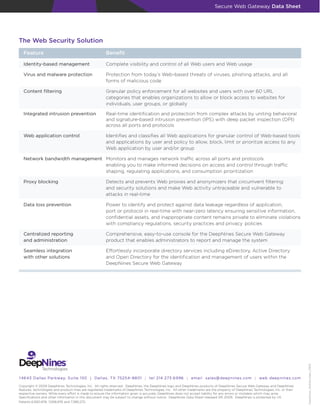 The DeepNines Secure Web Gateway is a comprehensive web security solution that protects, controls, and manages web applications and traffic with complete visibility and high performance. It includes features such as identity-based management, virus protection, content filtering, and real-time data loss prevention, all within a single appliance. This solution aims to solve the complexities of web threats while providing optimal usability and the lowest total cost of ownership for organizations.