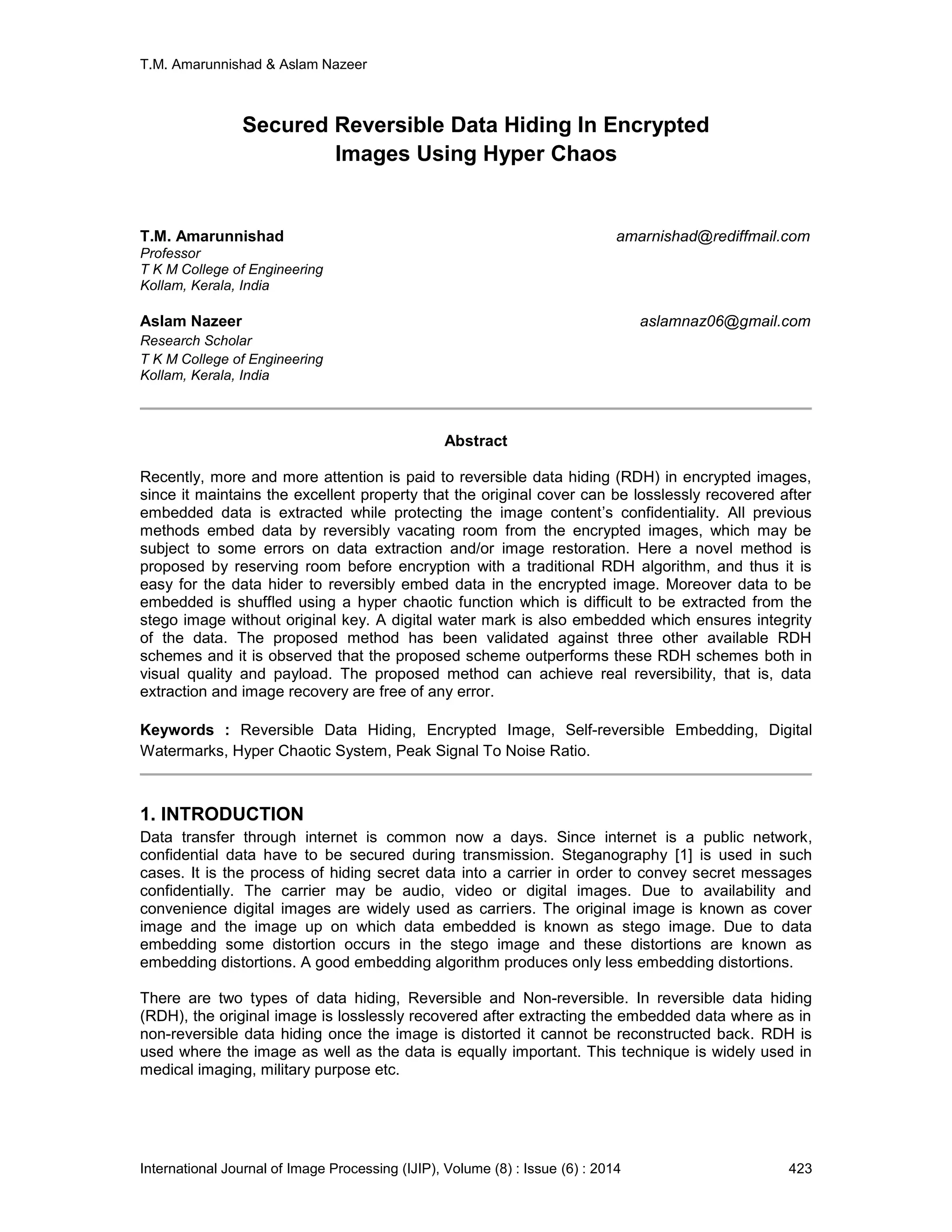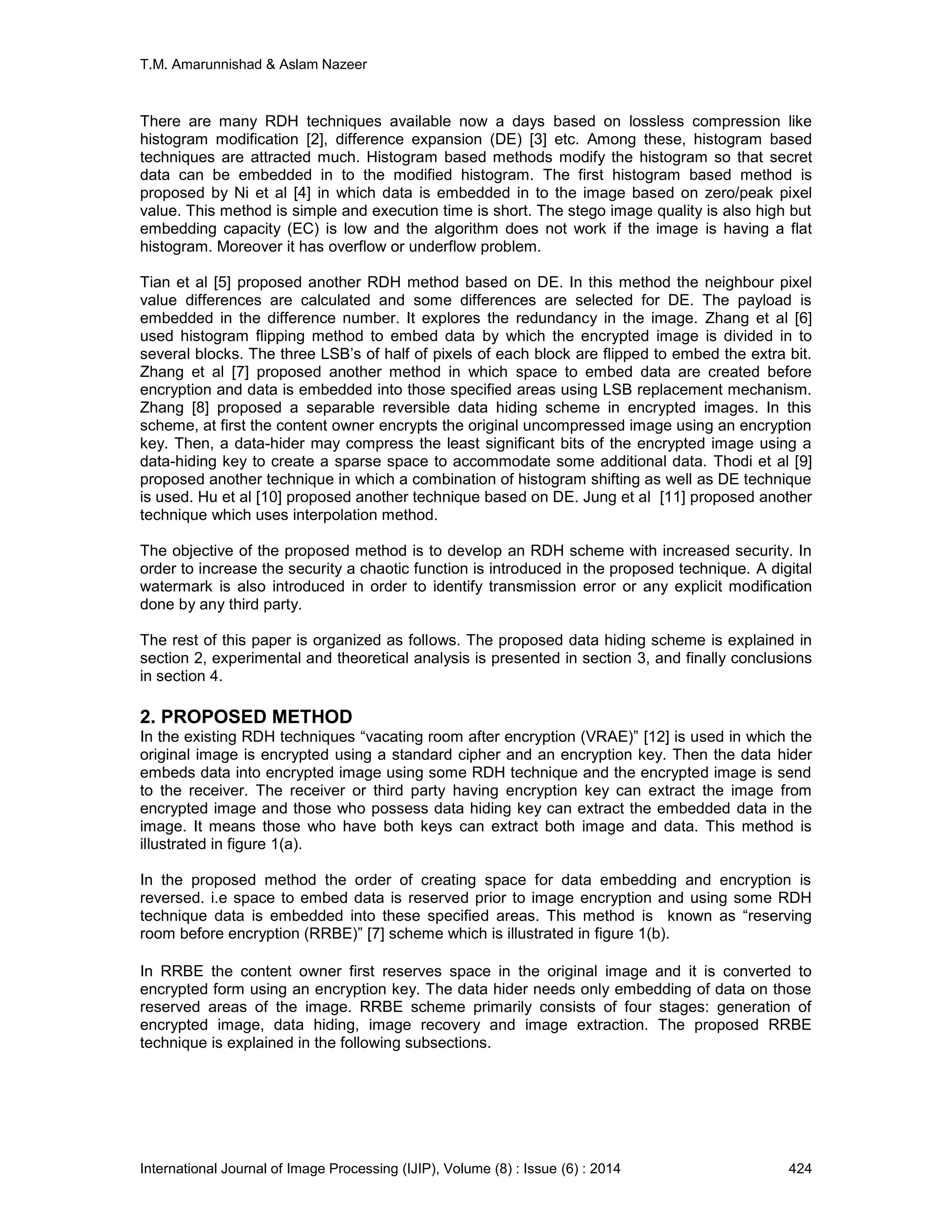 The document presents a novel method for reversible data hiding (RDH) in encrypted images, which reserves space for data embedding before encryption, thus allowing for lossless recovery of both image and data. This technique utilizes a hyper chaotic function for data shuffling and includes a digital watermark for integrity verification, outperforming existing RDH methods in visual quality and payload capacity. The proposed method demonstrates real reversibility and ensures data extraction and image recovery free from errors.