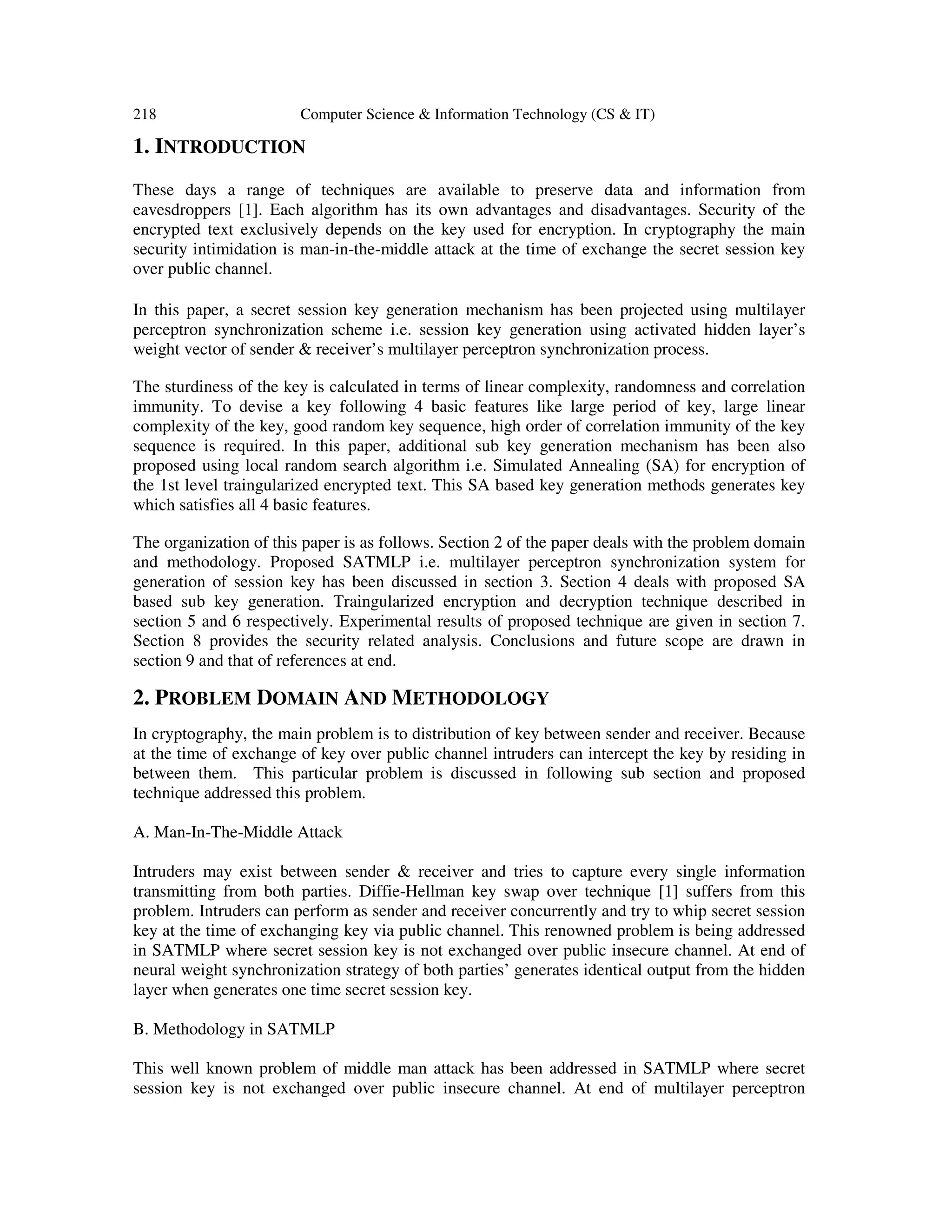 The document presents a novel approach to secure wireless communication using simulated annealing guided triangularized encryption with a multilayer perceptron (MLP) generated session key. It describes a method where both sender and receiver synchronize their MLPs to create an identical session key without transmitting it over public channels, thus mitigating man-in-the-middle attacks. The proposed technique is evaluated and compared with existing classical methods, demonstrating comparable performance in terms of security and efficiency.